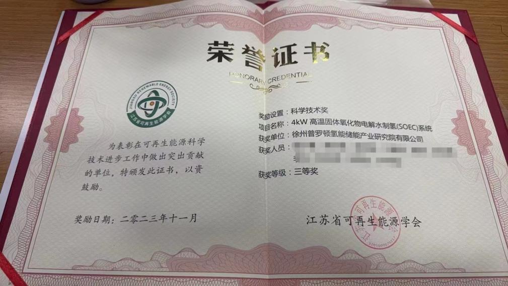 在江蘇省可再生能源學會科學技術獎頒獎典禮中,質子動力徐州公司“4KW高溫固體氧化物電解水制氫(SOEC)系統(tǒng)”獲得科學技術獎,公司技術部負責人康連喜獲得科學技術人物獎。質子動力徐州公司做為科學技術獎獲獎單位,受邀在現(xiàn)場做了關于《SOEC研發(fā)產(chǎn)業(yè)化進展及ReSOC發(fā)展趨勢》的報告。