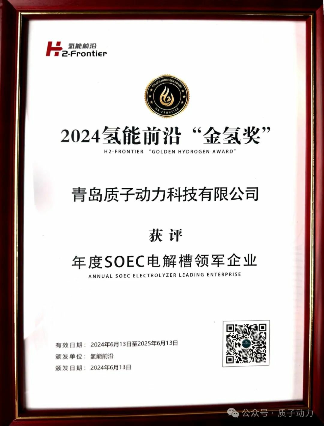 質(zhì)子動(dòng)力榮獲2024氫能前沿“金氫獎(jiǎng)”,年度SOEC電解槽領(lǐng)軍企業(yè)、年度杰出產(chǎn)品獎(jiǎng)